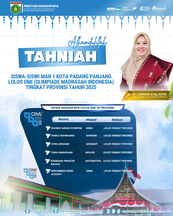 Dengan mengucapkan segala puji dan syukur ke hadirat Allah SWT, disertai rahmat dan karunia-Nya akhirnya Website madrasah ini dapat kami perbaharui dengan domain https://man1kotapadangpanjang.sch.id/ .Selamat datang di Website resmi Madrasah Aliyah Negeri 1 Kota Padangpanjang. Dalam perkembangan era globalisasi dan pesatnya kemajuan teknologi dan informasi ini, tidak dapat dipungkiri bahwa keberad...